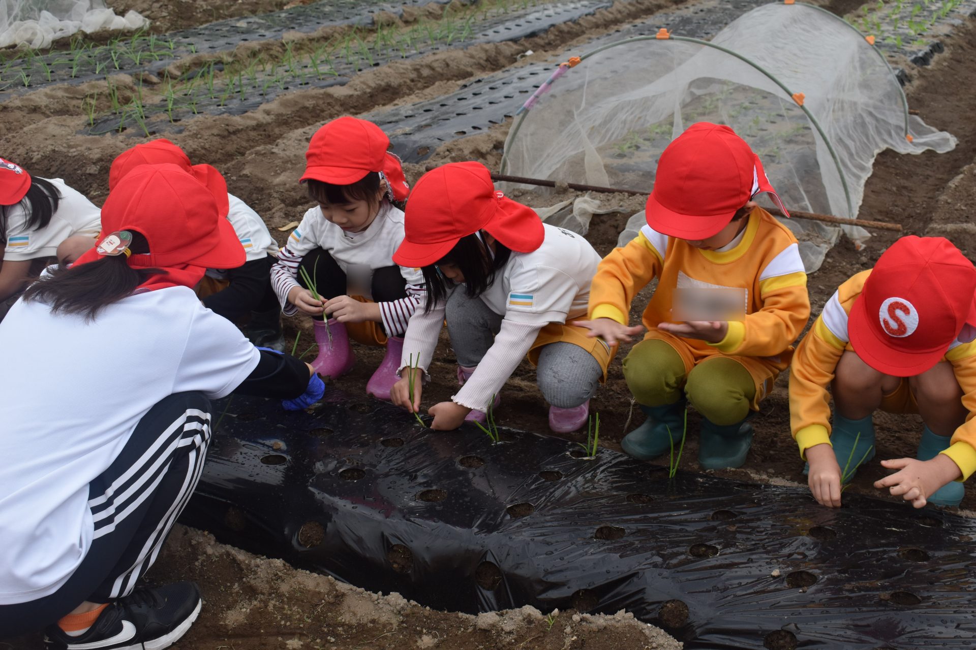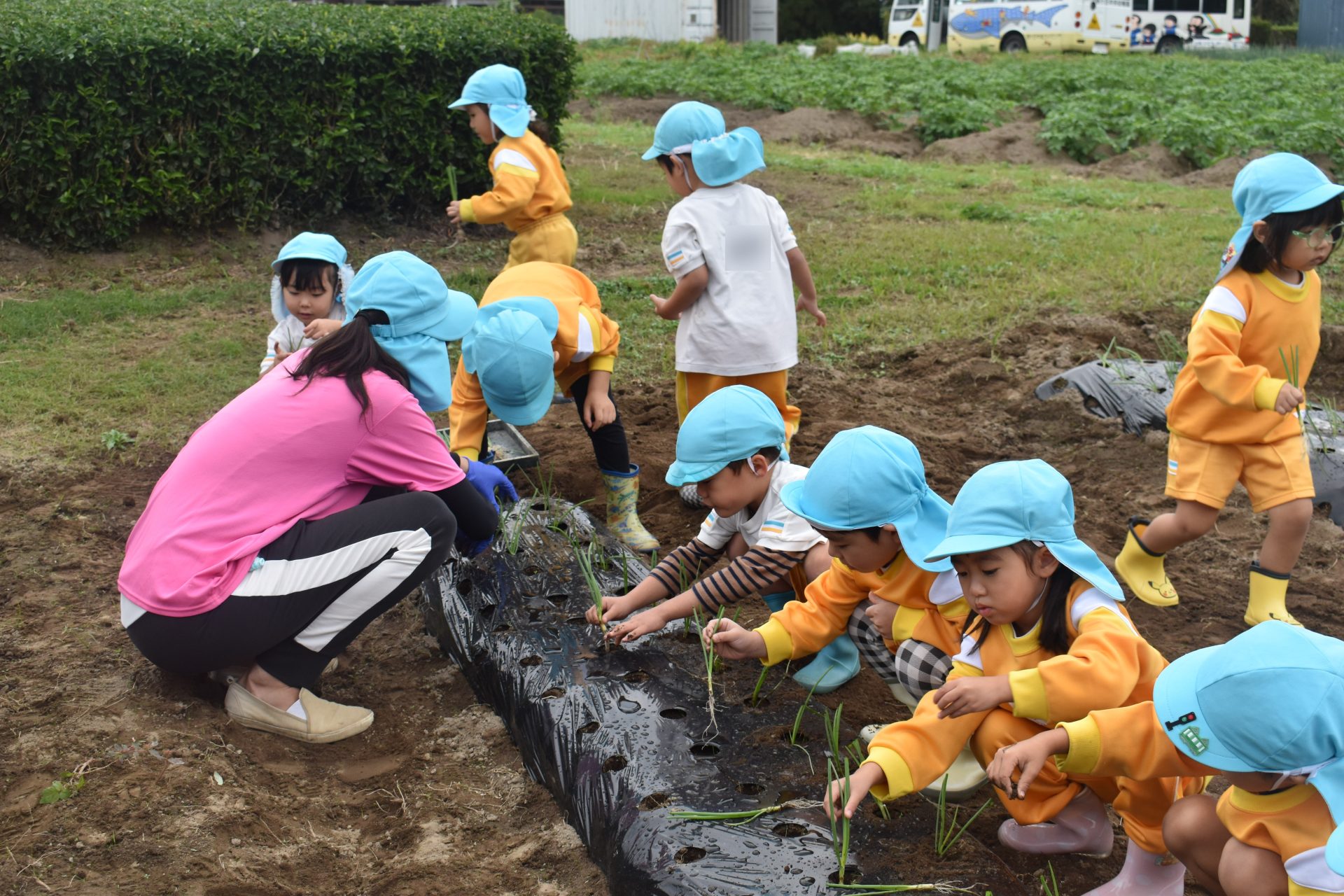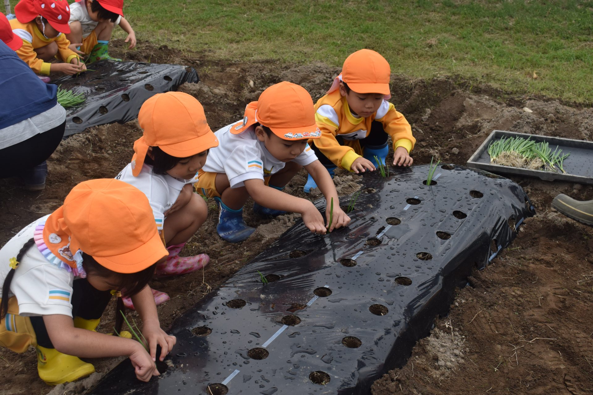 11月5日水曜日、年中組のこどもたちが「玉ねぎ植え付け」を行いました。各クラス1うね分約250本の玉ねぎの苗を植えました。植え方はとても難しいのですが、頑張って植えてくれました。おおきな玉ねぎに育ってほしいです。