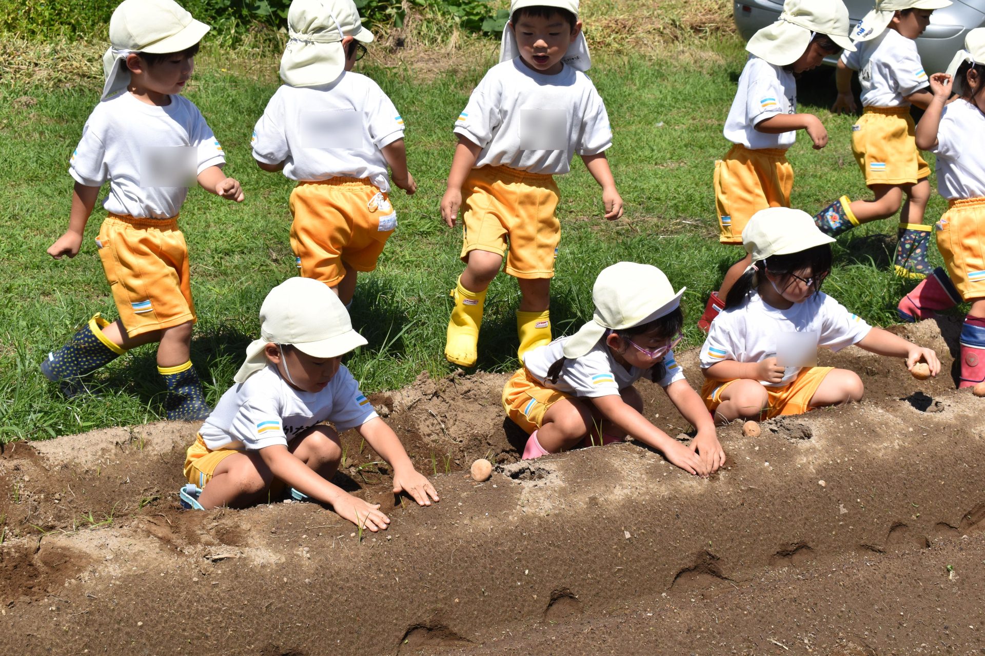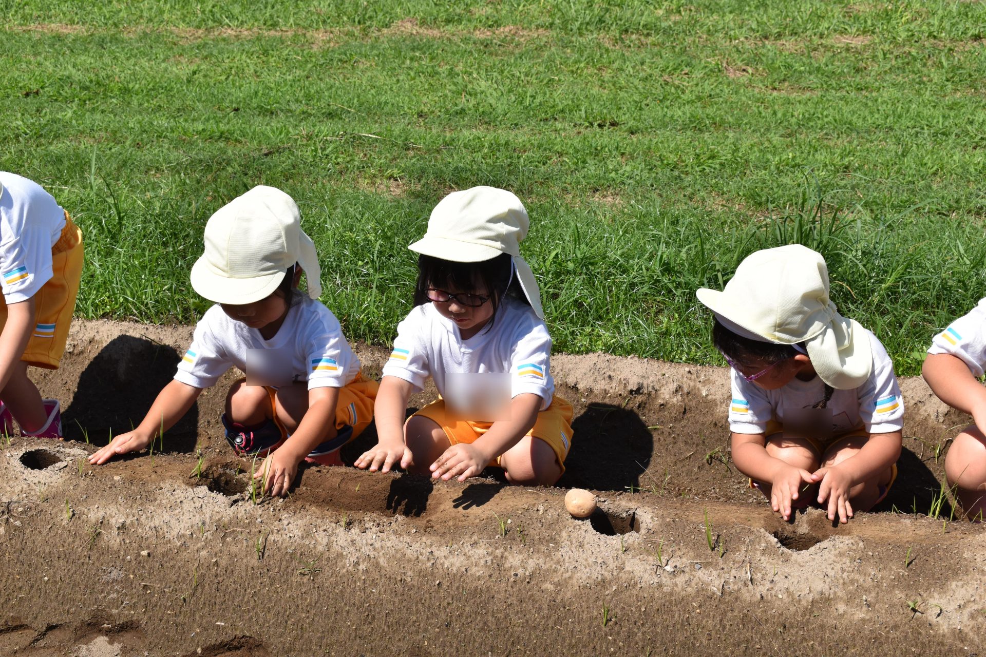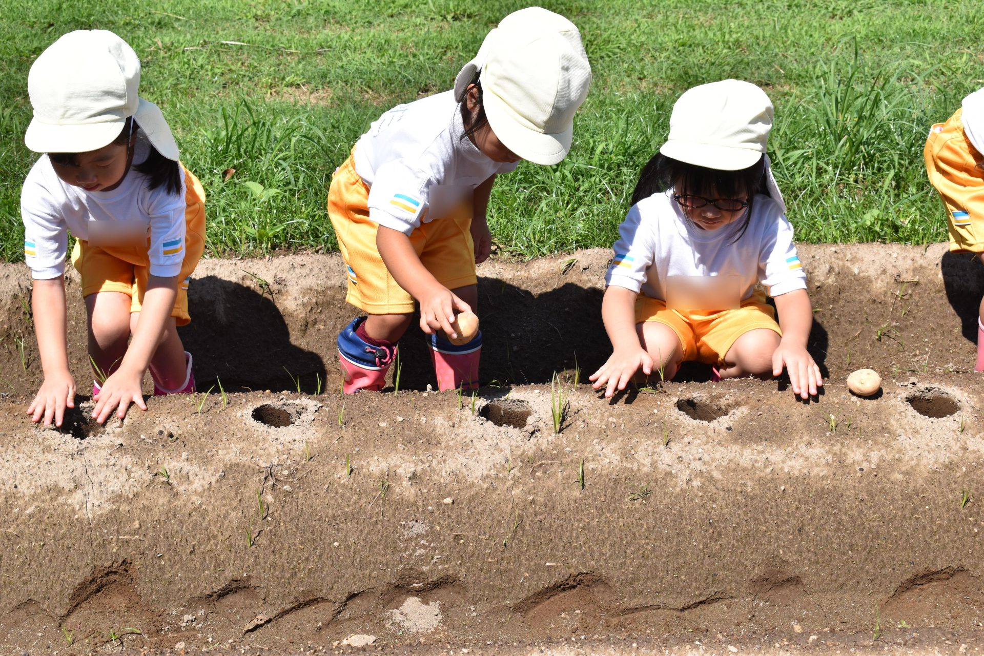 9月8日木曜日、たんぽぽ組の子どもたちが、ジャガイモの植え付けを行いました。ジャガイモの種芋を一個ずつ、穴に入れ、土をかぶせました。みんな上手に植え付けることができました。たくさんの種芋を植え付けましたが、子どもたちはまだまだやりたそうでした。12月ころ、収穫する予定です。大きくておいしいジャガイモがたくさん収穫できることを願っています。