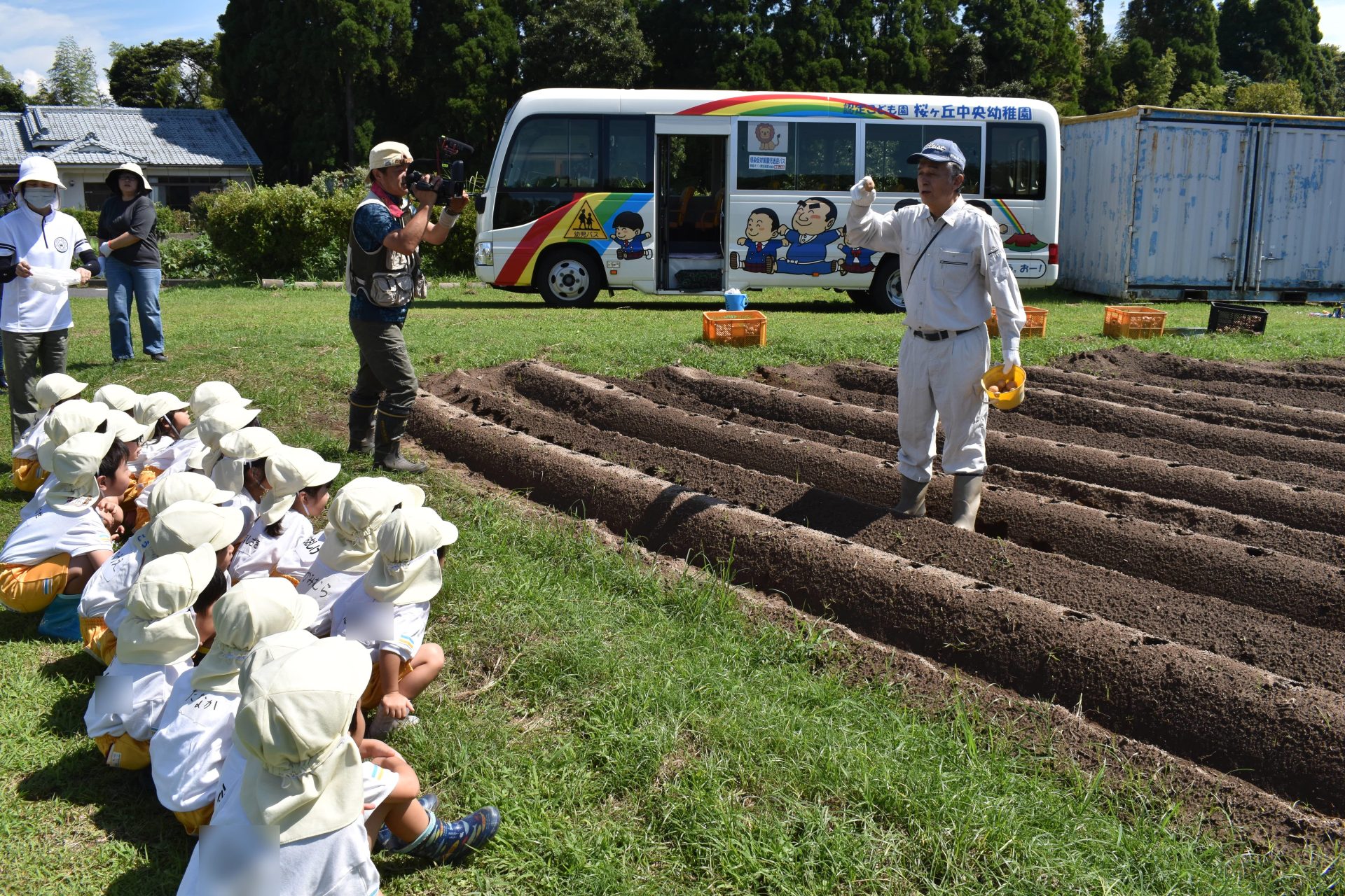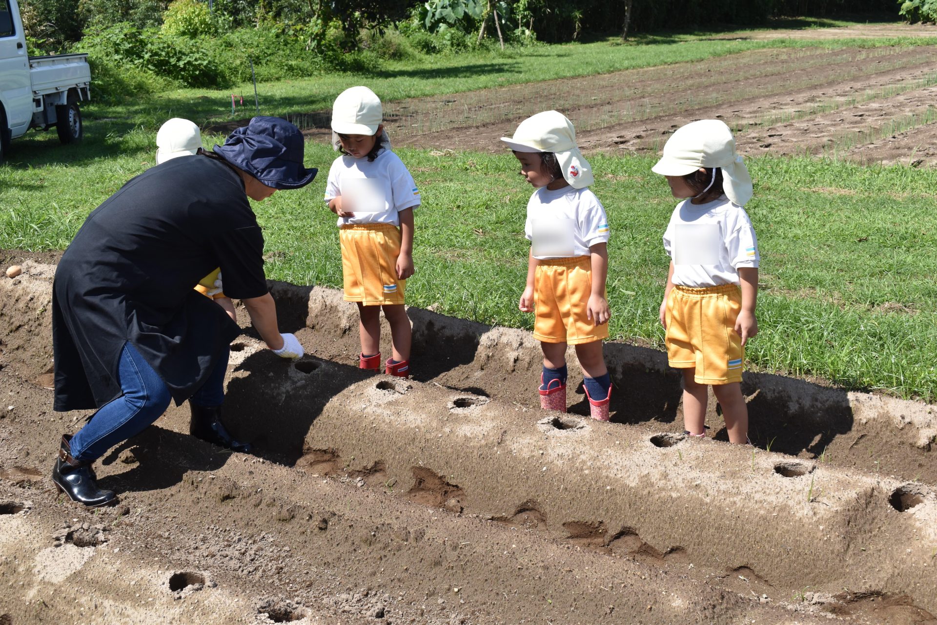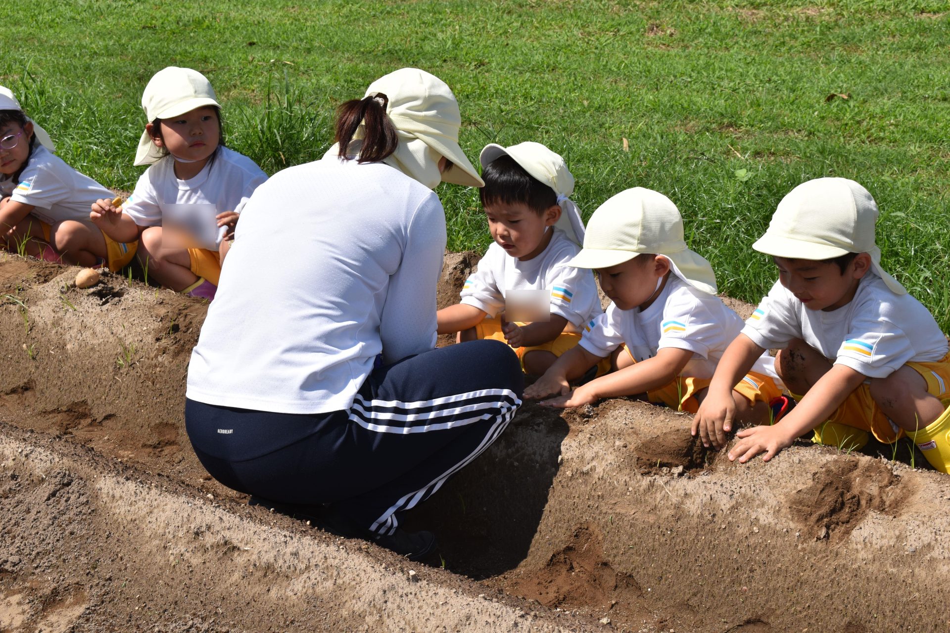 9月8日木曜日、たんぽぽ組の子どもたちが、ジャガイモの植え付けを行いました。ジャガイモの種芋を一個ずつ、穴に入れ、土をかぶせました。みんな上手に植え付けることができました。たくさんの種芋を植え付けましたが、子どもたちはまだまだやりたそうでした。12月ころ、収穫する予定です。大きくておいしいジャガイモがたくさん収穫できることを願っています。